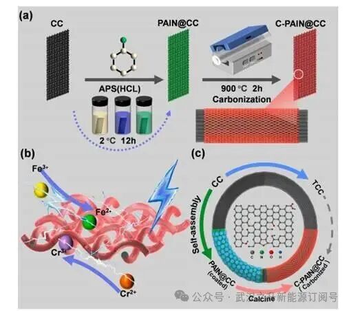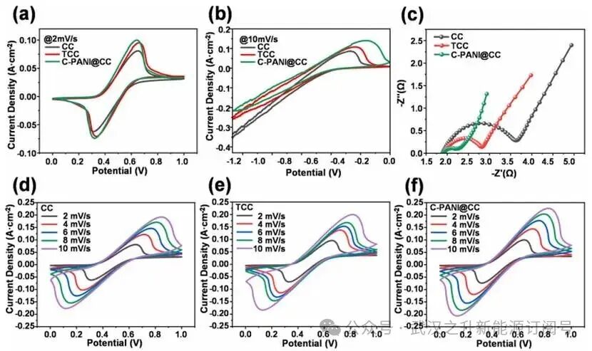 与对照样品相比,C-PANI@CC的Fe²⁺/Fe³⁺的CV曲线在阳极峰电流(Ipa)和阴极峰电流(Ipc)方面均表现出显著提升。此外,与CC和TCC相比,C-PANI@CC上Cr³⁺/Cr²⁺的氧化还原活性显著增强,峰值电流密度大幅提高,源于PANI衍生碳层提供的丰富活性位点,并促进了Cr³⁺/Cr²⁺氧化还原体系的反应动力学。