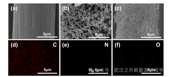 CC和TCC的纤维表面均具有相似的粗糙纹理,其特征为脊状结构。经过改性后,碳布表面被PANI衍生的涂层结构密集覆盖,在外围区域呈现出明显的异相成核诱导的PANI体相层。经过高温碳化处理后,外围异相成核的PANI体相结构基本消失,内层由丝状纳米纤维组成的多孔网状碳层得以保存。丰富的活性位点均匀分布于碳网络中,而交织的PANI衍生碳框架优化了导电网络,促进了电极-电解液界面处的离子扩散速率,从而提高了物质传输效率。元素分析进一步证实了C、N和O元素的均匀分布。