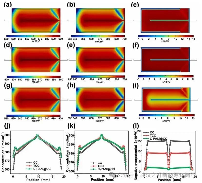 过电位分布图显示CC较低的导电性导致局部出现高电流密度区域,从而产生较高的过电位,降低了工作电压并加剧了欧姆损失;TCC的过电位虽有所降低,但改善幅度有限;相比之下,C-PANI@CC凭借其优异的导电性实现了均匀的电流分布,显著降低了局部过电位,提升了能量效率稳定性。
