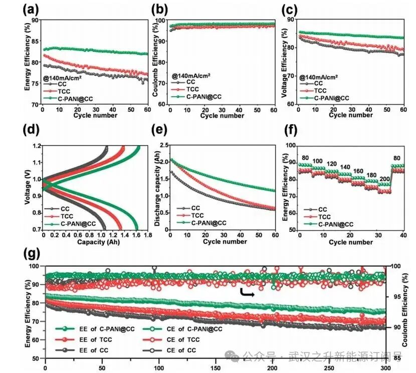 C-PANI@CC电极凭借独特的网状碳层结构,在所有性能指标上均表现优异:初始EE达到83.8%,较原始CC的79.17%显著提升;在60次循环中平均EE提升5.34%,稳定性也得到增强。C-PANI@CC的60次循环平均CE达97.94%,优于TCC(96.70%)和CC(96.87%);平均VE达84.35%,超过TCC(81.41%)和CC(79.76%)。