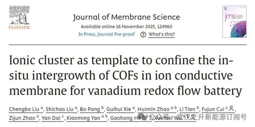 【2】Chengbo Liu, Shichao Liu, Bo Pang, Guihui Xie, Huimin Zhao, Li Tian, Fujun Cui,Zijun Zhao, Yan Dai, Xiaoming Yan, Gaohong He, Xuemei Wu, Ionic cluster as template to confine the in-situ intergrowth of COFs in ion conductive membrane for vanadium redox flow battery,2025,Journal of Membrane Science
