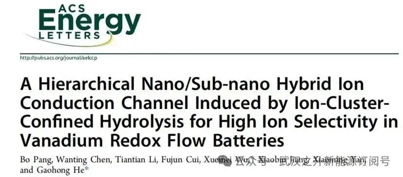 相关成果以“A Hierarchical Nano/Sub-nano Hybrid Ion Conduction Channel Induced by Ion-Cluster[1]Confined Hydrolysis for High Ion Selectivity in Vanadium Redox Flow Batteries”为题发表在ACS Energy Letters期刊上。