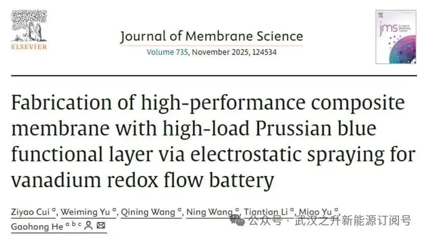 相关成果以“Fabrication of high-performance composite membrane with high-load Prussian blue functional layer via electrostatic spraying for vanadium redox flow battery”为题发表在Journal of Membrane Science期刊上。