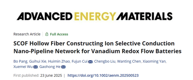 【5】Bo Pang, Guihui Xie, Huimin Zhao, Fujun Cui*, Chengbo Liu, Wanting Chen, Xiaoming Yan, Xuemei Wu*, Gaohong He*,SCOF Hollow Fiber Constructing Ion Selective Conduction Nano-Pipeline Network for Vanadium Redox Flow Batteries,Advanced Energy Materials, 2025, 2500523.