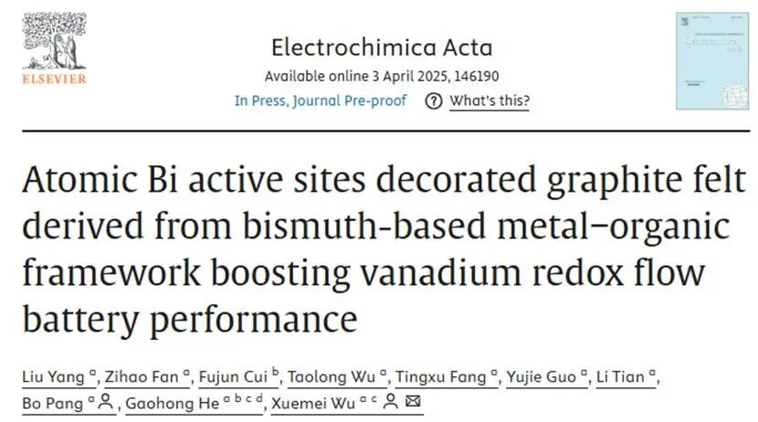 相关成果以“Atomic Bi active sites decorated graphite felt derived from bismuth-based metal−organic framework boosting vanadium redox flow battery performance”为题发表在Electrochimica Acta上。