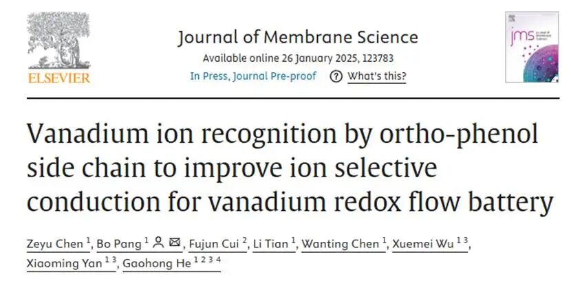 【7】Zeyu Chen, Bo Pang, Fujun Cui, Li Tian, Wanting Chen, Xuemei Wu, Xiaoming Yan, Gaohong He,Vanadium ion recognition by ortho-phenol side chain to improve ion selective conduction for vanadium redox flow battery.2025,Journal of Membrane Science