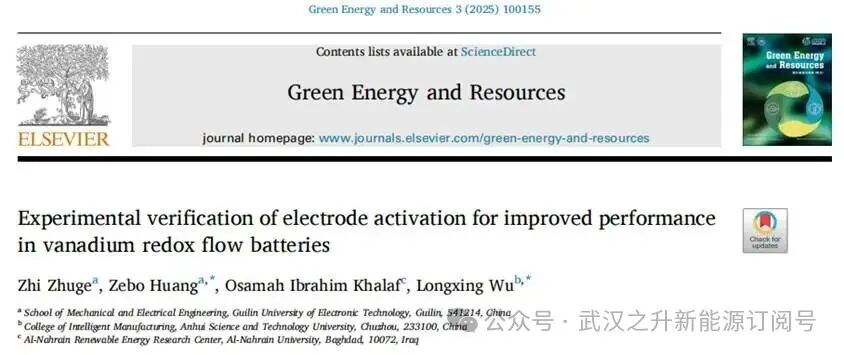 [6] Zhuge Z, Huang Z*, Khalaf O I, et al. Experimental verification of electrode activation for improved performance in vanadium redox flow batteries[J]. Green Energy and Resources, 2025: 100155. https://doi.org/10.1016/j.gerr.2025.100155