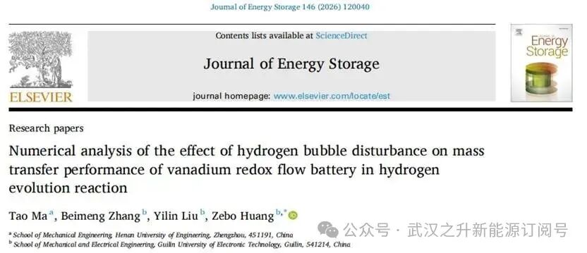 [7] Ma, T., Zhang, B., Liu, Y., & Huang, Z*. Numerical analysis of the effect of hydrogen bubble disturbance on mass transfer performance of vanadium redox flow battery in hydrogen evolution reaction. Journal of Energy Storage, 2026, 146, 120040. https://doi.org/10.1016/j.est.2025.120040